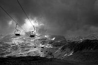 Das Foto wurde in Schwarz-Weiß umgewandelt, um den leeren Stühlen im Skigebiet von Kärnten einen dramatischen Charakter zu verleihen.