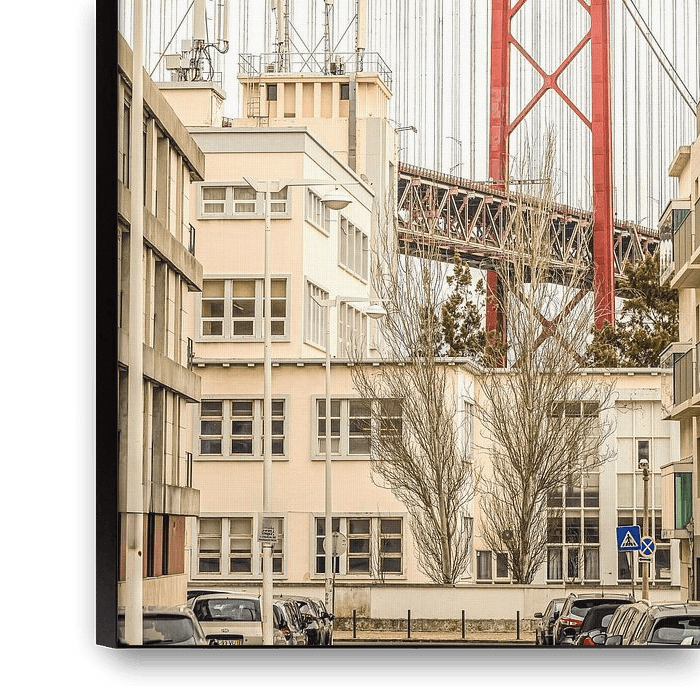 Das Foto zeigt die markante rote Brücke 25 de Abril in Lissabon, die sich über eine städtische Umgebung erhebt, eingerahmt von alltäglichen Wohnhäusern und einem bewölkten Himmel. Der Kontrast zwischen der Industriearchitektur der Brücke und der sie umgebenden Wohnbebauung schafft eine visuell fesselnde Szene. Die Brücke als…