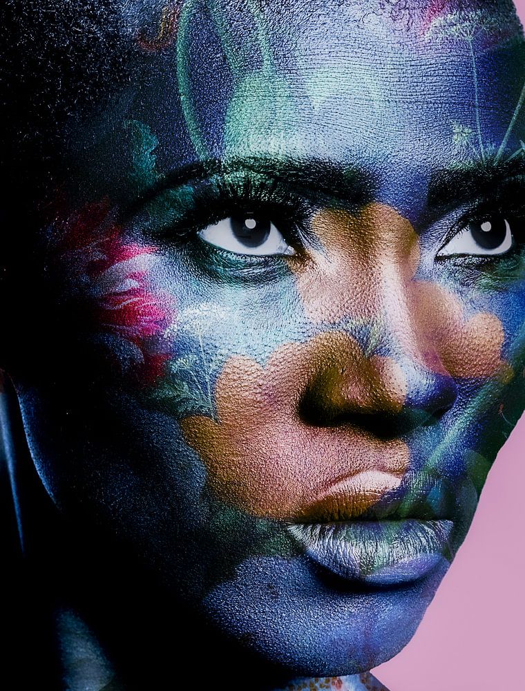 Die Zeichnung auf ihrer Haut ist das Gemälde "Stillleben mit Blumen in einer Glasvase" des niederländischen Malers Jan Davidsz. de Heem (1606 - 1684).