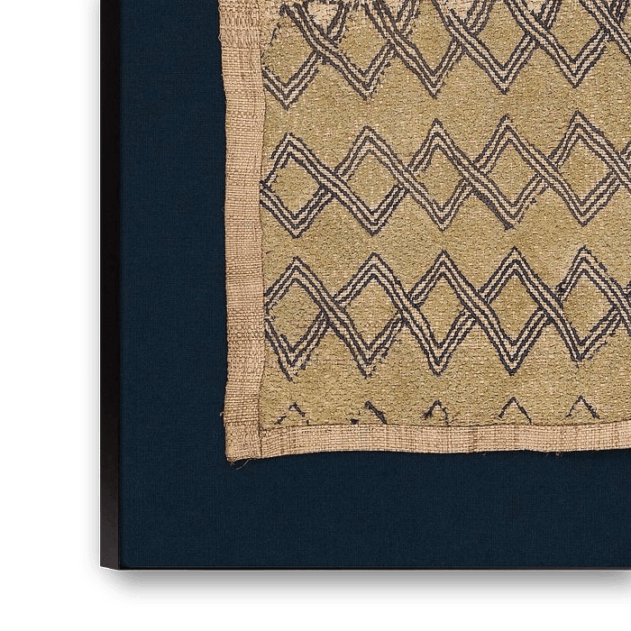 Dies ist ein zeremonielles Tuch aus Raphia mit einem gestickten geometrischen Muster. Sie wird vom Stamm der Shoowa in Kongo-Kinshasa hergestellt, die zur größeren ethnischen Gruppe der Kuba gehören. Es ist eine uralte Technik und Tradition, die durch die engen geometrischen Muster sehr modern aussieht. Es ist ein schönes, authentisches Objekt, das sehr gut in einem modernen und schlichten Interieur funktioniert.