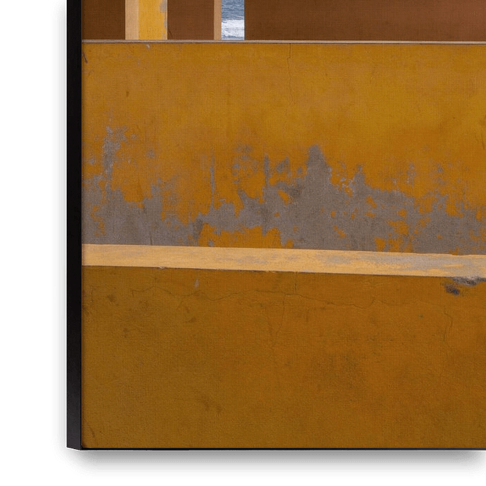 Von einem verlassenen Haus aus blicken wir auf die Kapverdischen Inseln. Abblätterndes Ockergelb auf kompakten Formen bildet einen Kontrast gegen das wilde Meer und die zerklüfteten Berge am Horizont.