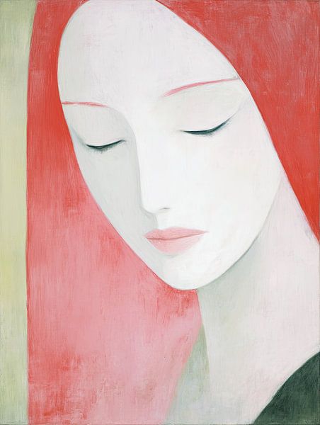 Zij in Koraallicht - Dit is een uiterst ingetogen vrouw schilderij waarin twee elementen alles dragen: het bleke, bijna porseleinen gezicht en het brede koraalrode vlak dat als haar en achtergrond tegelijk fungeert. Als kunstenaar kies je ervoor het gezicht extreem te vereenvoudigen — een groot, zacht ovaal wit oppervlak met nauwelijks…