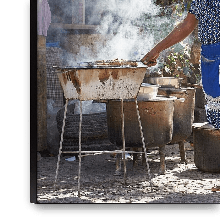 Kreolin in einem blauen Kleid, die auf dem Grill Hühnchen zubereitet. Sie sieht aus, als sei sie der Chef in der Küche. Dieses Bild wurde auf der kapverdischen Insel Praya aufgenommen.