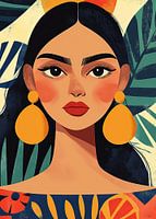 Dieses Werk zeigt eine Frau mit ruhigem Blick, aufrechter Haltung und einer Atmosphäre aus Blättern und Blumen. Das Porträt strahlt ein Gefühl der Präsenz aus, als ob die Figur Teil ihrer Umgebung ist und sich doch von der Betriebsamkeit abhebt. Ihre großen, ovalen Ohrringe ziehen die Aufmerksamkeit auf sich und verstärken das…