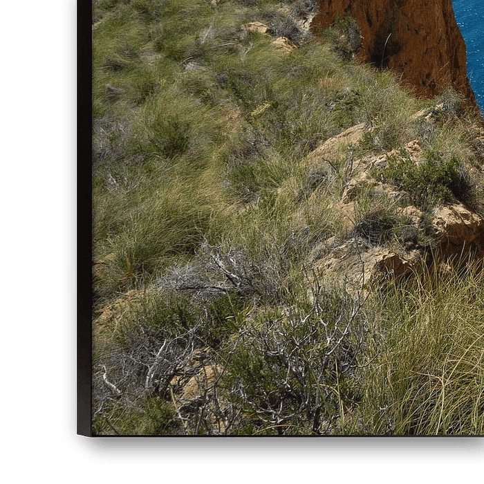 Der Naturpark Sierra Helada liegt zwischen den Küstenstädten Altea und Benidorm. Die langgestreckte Bergkette ragt majestätisch ins Meer und ist bereits aus der Ferne gut sichtbar. Das Wandern in der Sierra Helada bietet wunderbare Ausblicke auf das blaue Mittelmeer, die steilen Klippen und in Richtung der anderen Berge in Küstennähe. Dieses Foto ist den beeindruckenden Felsformationen am Morro Sant Jordí gewidmet, die sich im nördlichen Bereich des Berges befinden .