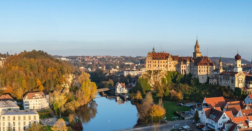 Die Stadt Sigmaringen mit dem Hohenzollernschloss, eine Sehenswürdigkeit und Touristenattraktion oberhalb der Altstadt und der Donau mit herbstlicher Vegetation