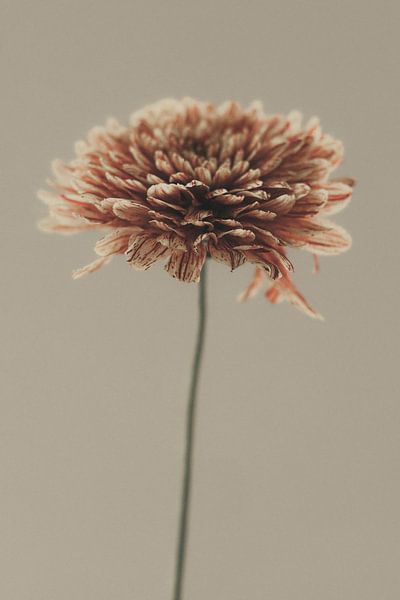Ihre Form ist noch intakt, löst sich jedoch sanft auf, als befände sie sich zwischen Blüte und Verfall. Die gedämpften Farbtöne und die zarte Textur verleihen ihr eine ruhige, zeitlose Anmutung.