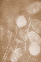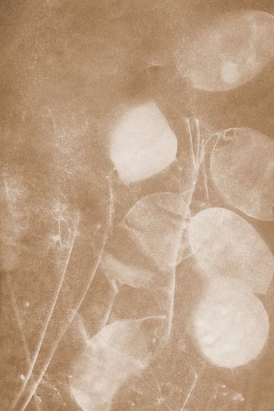 Die durchscheinenden, botanischen Formen der Samenkapseln der Silberblattpflanze oder Mondviole (Lunaria) heben sich vor einem sepiagetönten Hintergrund ab und vermitteln ein Gefühl der Ruhe. Das ätherische Design fängt natürliche Elemente auf wunderschöne Weise ein.