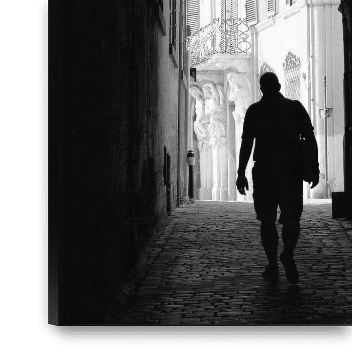 Silhouet in Italiaans steegje. Jesi, de Marche. Zwart/wit.