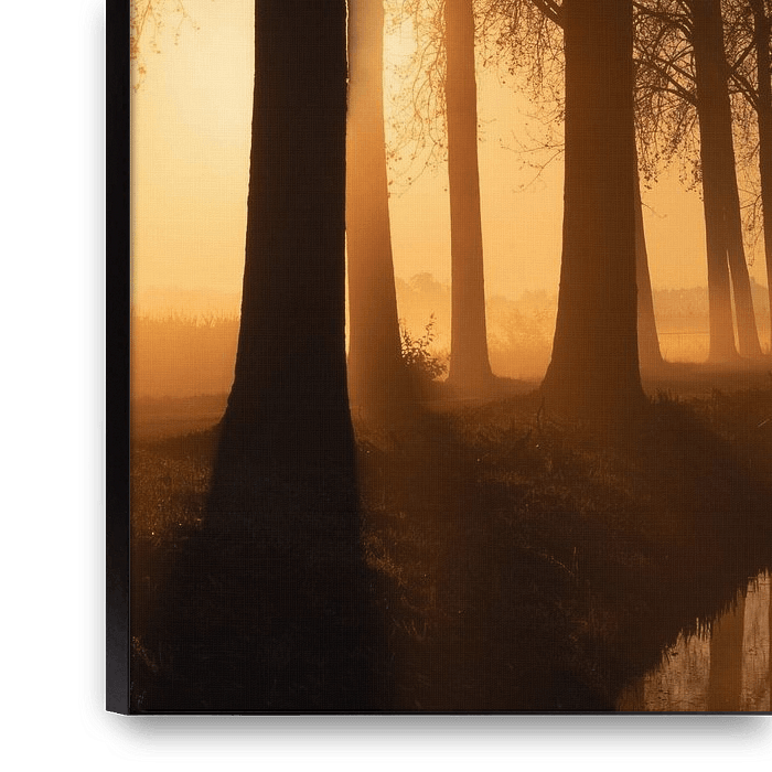 Auf dieser Landstraße im Polder gibt es auf beiden Seiten Baumreihen. An diesem nebligen Morgen färbte sich der Himmel in ein schönes warmes Orange, und das Umgebungslicht verlieh den Bäumen eine schöne Silhouette.
