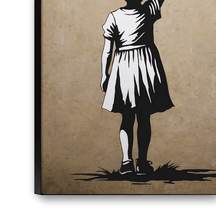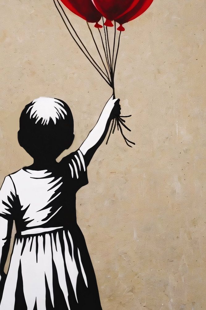 Dieses wunderschöne Kunstwerk zeigt die Silhouette eines jungen Mädchens, das ein Bündel leuchtend roter Luftballons in der Hand hält. Die Ballons scheinen aufgrund ihrer glänzenden Textur und der tiefroten Farbe fast von der Leinwand zu platzen. Dieser Kontrast zu dem neutralen, beigen Hintergrund verleiht dem Design ein kraftvolles und doch verspieltes Aussehen. Der Einsatz von Schatten und Licht in der schwarz-weißen Silhouette des Mädchens schafft eine geheimnisvolle Atmosphäre. Dieses zeitlose Werk würde in jedem modernen Interieur ein Statement abgeben und kann eine Quelle der Inspiration für Jung und Alt sein. Es ist eine perfekte Mischung aus Street Art und Minimalismus und ideal für alle, die ihren Räumen ein Kunstwerk mit Geschichte und Charakter hinzufügen möchten.