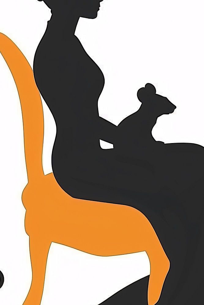Eine elegante Silhouette einer Frau, die auf einem verzierten Stuhl sitzt und eine kleine Maus in den Händen hält. Der Kontrast zwischen der dunklen Figur und dem hellen Hintergrund schafft ein Gefühl von Geheimnis und Intrige. Die Schlichtheit des Entwurfs unterstreicht die Schönheit der Form und die Anmut der Pose. Ein zeitloses Kunstwerk, das jedem Raum einen Hauch von Raffinesse verleiht.