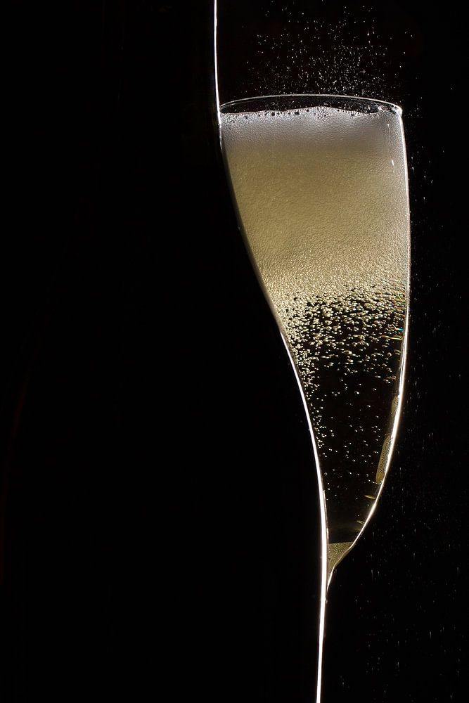 Minimalistische, zurückhaltende Aufnahme einer Champagnerflasche und eines Glases. Das Bild ist komplett schwarz, mit Ausnahme der Konturen der Flasche, des Glases und der Blasen.