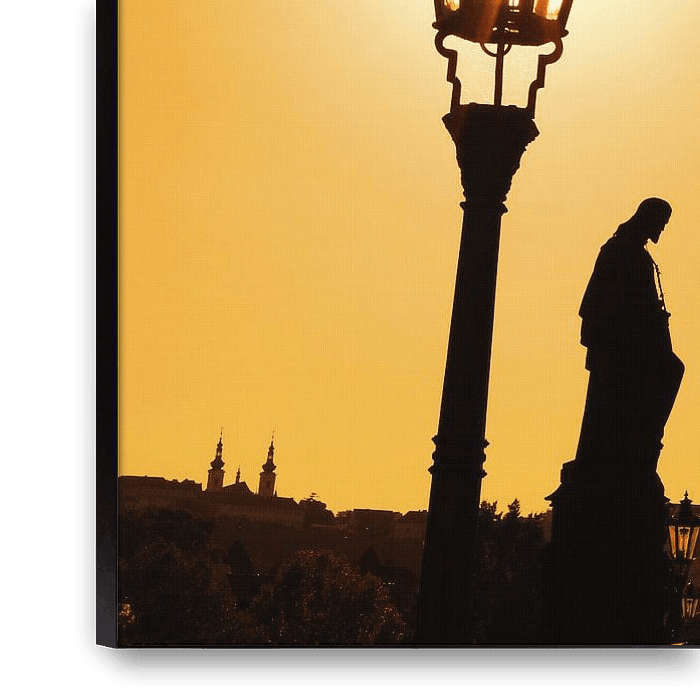 Sonnenuntergang im Gegenlicht Silhouetten von Straßenlaternen, Statuen und Dächern der Skyline der Stadt an der Karlsbrücke in Prag, Tschechische Republik