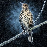 Digitale Fotobearbeitung einer Singenden Drossel im Regen.