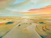 Dieses kompakte Ölgemälde präsentiert eine eindringliche Szenerie, die vielfältige Interpretationsmöglichkeiten und emotionale Resonanzen hervorruft. Im Zentrum des Gemäldes erstreckt sich ein Fluss, dessen Ufer von einigen Menschen bevölkert sind, die in ihrer Haltung eine gewisse Unsicherheit oder Ratlosigkeit auszustrahlen scheinen.…