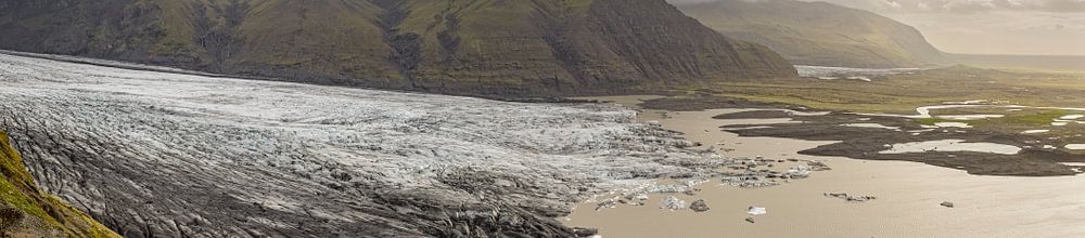 Panoramablick auf den Gletscher Skaftafellsjökull im Skaftafell-Nationalpark, Island. An einem Sommertag. Der Skaftafell-Gletscher ist Teil des größeren Vatnajökull-Nationalparks. Der Skaftafell-Nationalpark befindet sich im Südosten Islands und ist für seine dramatische und abwechslungsreiche Landschaft bekannt. Der Park erstreckt sich über eine Fläche von etwa 4800 Quadratkilometern und umfasst Gletscher, Berge, Wasserfälle und Wälder. Eines der bemerkenswertesten Merkmale des Skaftafell-Nationalparks ist der Vatnajökull, der größte Gletscher Europas. Der Gletscher bedeckt etwa 8 % der isländischen Landmasse und ist an manchen Stellen bis zu 1000 Meter dick. Besucher können auf geführten Gletschertouren dieses beeindruckende Naturwunder erkunden. Der Park beherbergt auch mehrere beeindruckende Wasserfälle, darunter Svartifoss und Hundafoss. Der Svartifoss ist besonders einzigartig, denn er ist von hoch aufragenden Basaltsäulen umgeben, die an eine Orgelpfeife erinnern. Der Hundafoss hingegen ist ein eher traditioneller Wasserfall mit mehreren Kaskaden, die eine felsige Felswand hinunterstürzen. Neben diesen Naturwundern bietet der Skaftafell-Nationalpark auch mehrere Wanderwege, auf denen die Besucher die vielfältige Landschaft des Parks erkunden können. Die Wanderwege reichen von leicht bis anspruchsvoll und bieten atemberaubende Ausblicke auf Gletscher, Berge und Wälder. Insgesamt ist die Landschaft des Skaftafell-Nationalparks ein wunderschönes und beeindruckendes Beispiel für die Naturwunder, die man in Island finden kann.