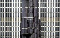 Die Glas- und Stahlskulptur „Kristallvertikalaccent“ von Edwin Öhrström steht vor der Fassade eines modernen Bürogebäudes am Sergelstorg-Platz in Stockholm, Schweden