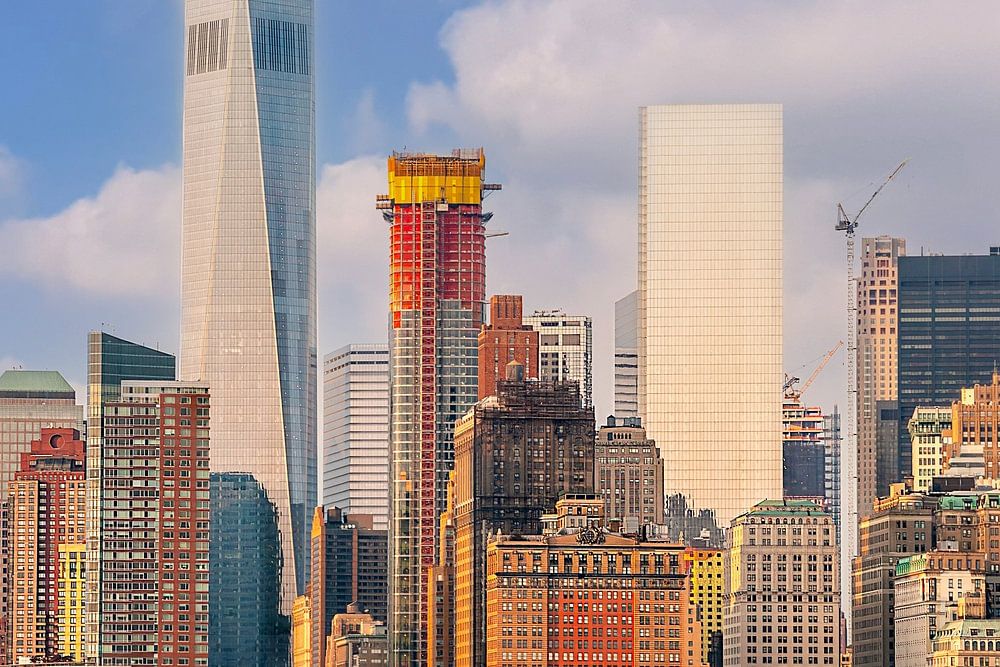 Die Brooklyn Bridge mit einem Wassertaxi, das mit voller Geschwindigkeit den Hudson hinunterfährt.