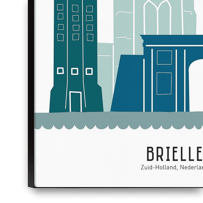 Bestelle diese Illustration Skyline-Abbildung Brielle in Farbe von Mevrouw Emmer als Reproduktion auf Leinwand, Alu-Dibond, als Poster, Fototapete oder Acrylglasbild.