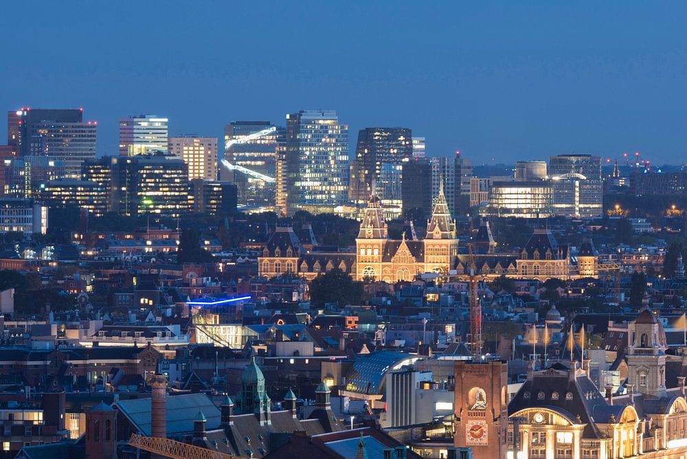 Skyline von Amsterdam während der blauen Stunde. Das Foto wurde an einem besonders klaren Tag aufgenommen. Zuidas und Rijksmuseum sind deutlich zu sehen.