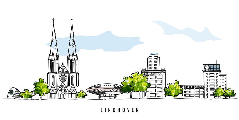 Eindhoven ist meine Geburtsstadt. Natürlich muss sie in meiner Serie über niederländische Städte dabei sein! Ich habe alte, noch ältere und ein relativ neues Element in die Skyline eingezeichnet. Auf jeden Fall mit dem Evoluon und Philips!