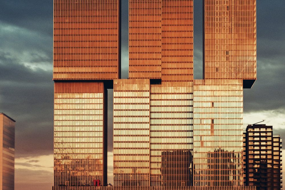 Fotografiert von Willemskade an der Maas aus. Kop van zuid mit NH Hotel, The Tower of South, New Orleans, Wilhelminapier, Kreuzfahrtterminal