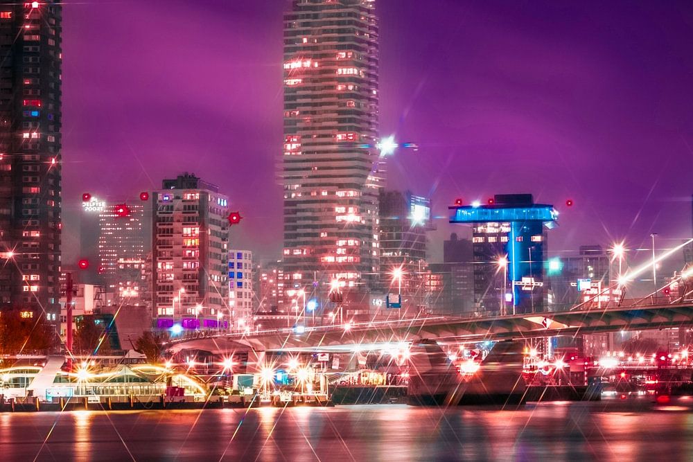 Mit diesem Bild an der Wand holen Sie sich ein Stück Metropole in Ihr Zuhause. Jedes Mal, wenn Sie es betrachten, werden Sie sich in die magischen Abende an der Maas zurückversetzt fühlen.