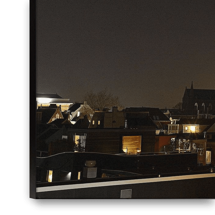 Bestelle das Foto Skyline von Utrecht mit rot-weiß beleuchtetem Domturm. von Margreet van Beusichem als Reproduktion auf Leinwand, Alu-Dibond, als Poster, Fototapete oder Acrylglasbild.