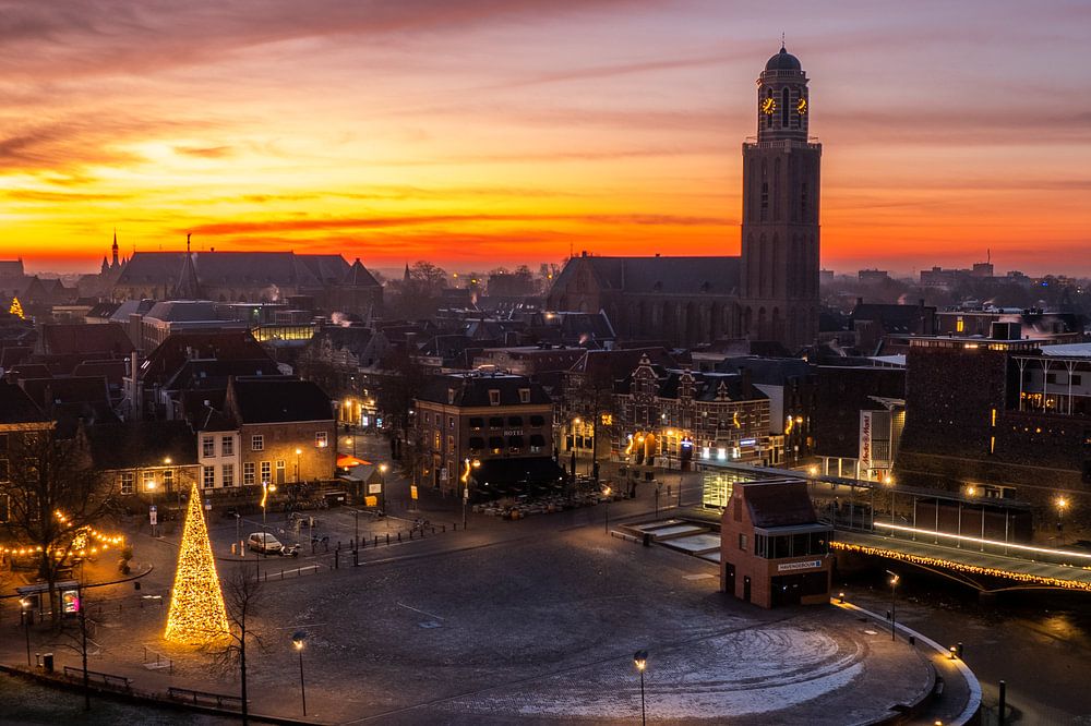 Das Foto zeigt die Skyline des Stadtzentrums von Zwolle, aufgenommen an einem der kältesten Tage des Jahres 2022 (im Dezember) in den frühen Morgenstunden, als ganz Zwolle noch schlief.