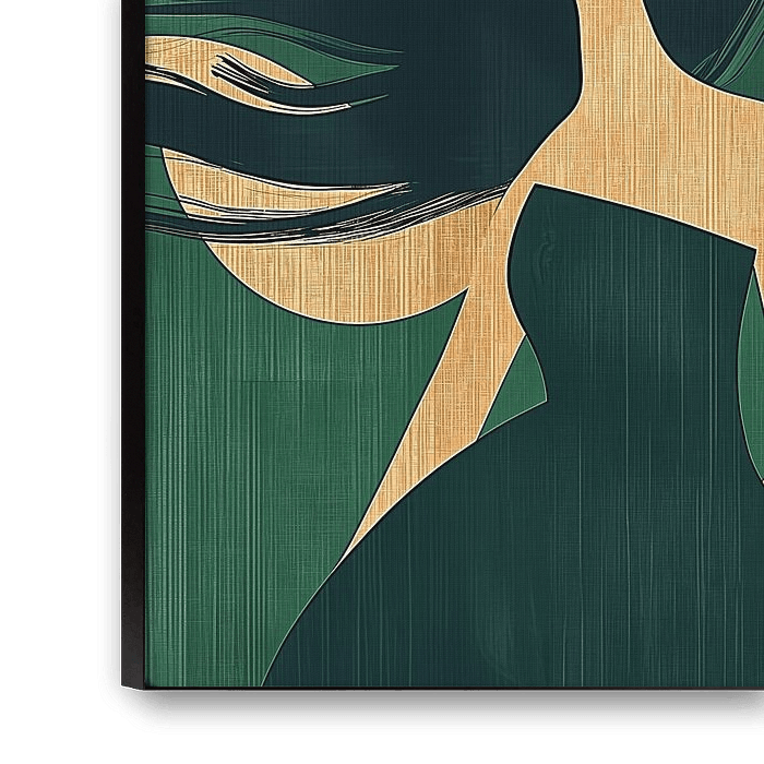 Dieses digitale Kunstwerk verbindet geometrische Abstraktion mit femininer Eleganz. Eine beige feminine Silhouette kontrastiert mit einem tiefgrünen, rechteckigen Hintergrund. Wellenförmige schwarze Linien deuten auf bewegtes Haar hin. Die Spannung zwischen kantigen und organischen Formen lädt zum Nachdenken über Natur versus Urbanität und Femininität versus Architektur ein. Das Werk vereint Kraft, Anmut und Geheimnis, stellt die traditionelle Porträtmalerei in Frage und ermutigt den Betrachter, über Form, Raum und Identität in einem modernen Kontext nachzudenken.