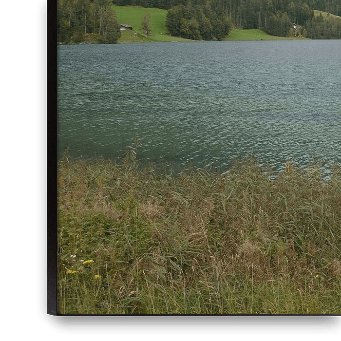 "Emerald Silence" Das Bild fängt die tiefe Stille eines abgelegenen Bergsees in einem Moment vollkommener atmosphärischer Klarheit ein. Die Komposition wird durch das strukturierte Schilf und Gras am Ufer geerdet, das den Blick des Betrachters über das weite, blaugrün schimmernde Wasser hin zu einer dramatischen Kulisse aus…