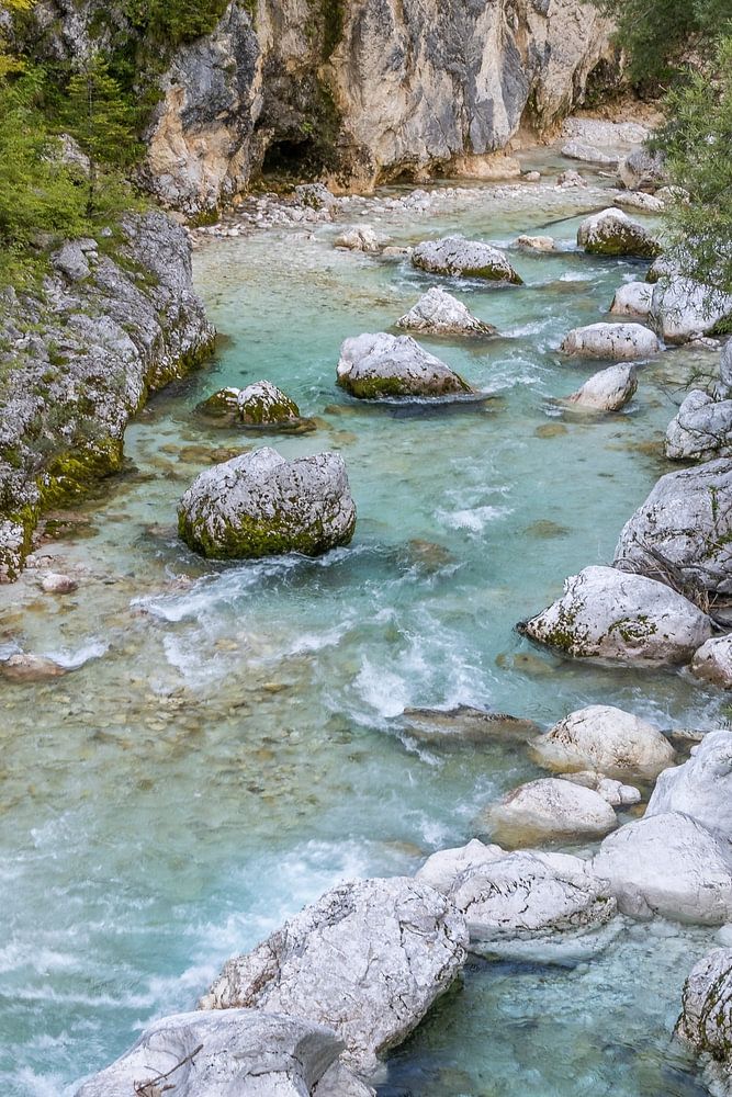 Dieses Bild habe ich von einer der vielen Hängebrücken aus aufgenommen, über die man bei einer Wanderung zwischen Trenta und Bovec kommt. Hier blickt man direkt von oben auf das Wasser, wo mehrere Felsen auf dem Flussgrund verstreut sind. Der Fluss erhält seine schöne blaue Farbe durch die weißen Kalksteinfelsen, aus denen die Landschaft besteht.