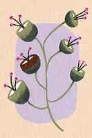 In diesem Werk entfaltet sich ein verspielter Ast mit organischen Formen, die an Beeren oder Samenkapseln erinnern. Die sanften Grüntöne werden mit dezenten rosa Akzenten kombiniert. Die lila Fläche im Hintergrund bringt Ruhe und Ausgewogenheit in die Komposition.
