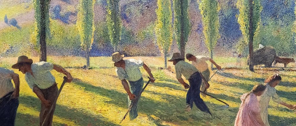 Rasenmäher mähen auf dem Feld, während Kinder und Mädchen für die Männer spielen. Im Hintergrund wird ein Wagen mit dem gemähten Gras gezogen, der von einem Lasttier gezogen wird.