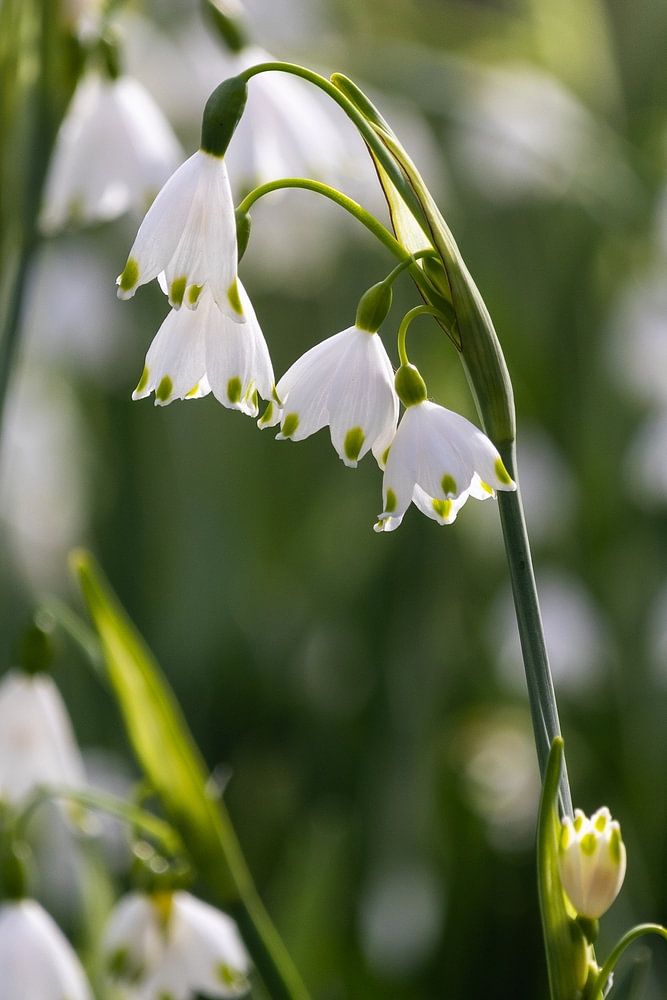 Wunderschöne Leucojum aestivum-Blüten, auch bekannt als Spätblühende Knotenblume oder Sommer-Knotenblume. Die zarten weißen Blüten mit ihren hängenden, glockenförmigen Blütenblättern hängen anmutig an einem gebogenen Stängel, der sich von einem unscharfen Hintergrund aus grünem Laub abhebt, das in sanftes Sonnenlicht getaucht ist. Das warme, goldene Licht, das durch das Laub fällt, schafft eine ruhige und friedliche Atmosphäre und unterstreicht die subtile Schönheit dieser Frühlingsblumen.