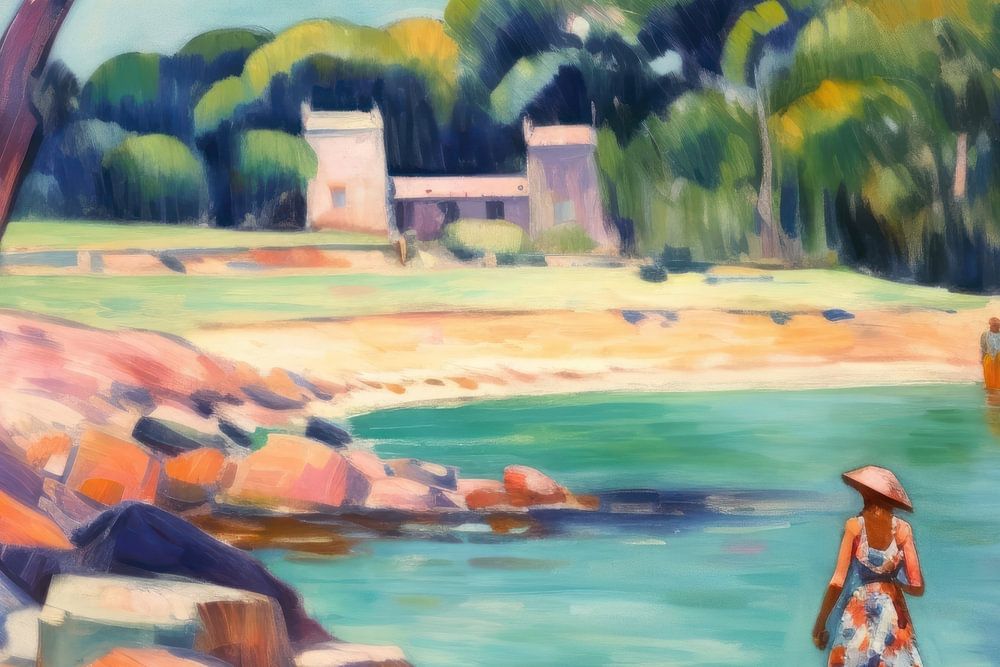 Sommerliche Stimmung an einer mediterranen Küstenlandschaft im Stil eines Gemäldes das an Matisse erinnert.