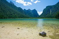Der einzigartige Blick über den Toblacher See zu den umliegenden Dolomiten an einem tag im Sommer. Auf der gegenüberliegenden Seite ragen Rollkopf, Schmiedenkofel, Kreuzspitz, Ebenkofel und Nasswand über dem See in den blauen Himmel.