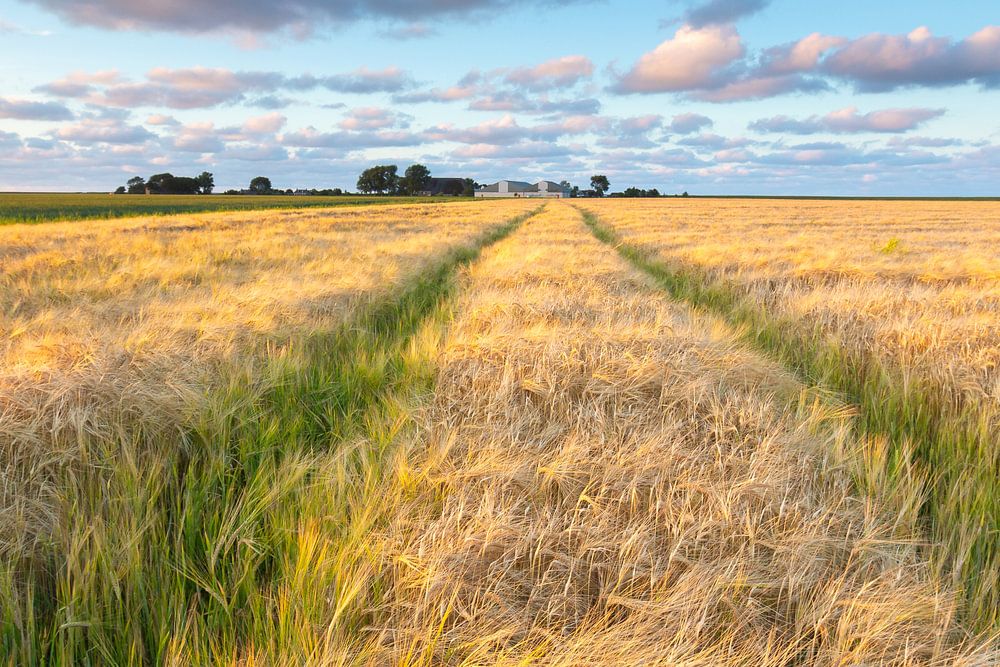 An einem schwülen Abend fällt das warme Abendlicht auf die Getreidefelder des Groninger Hogeländes. Ein schöner Wolkenhimmel schwebt über der Landschaft. Ein Foto, das Lust auf den Sommer macht.