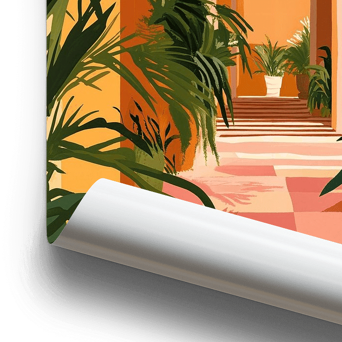 In diesem Kunstwerk wird eine farbenfrohe marokkanische Straße in einer Mischung aus warmen und bunten Farben und Tönen zum Leben erweckt, die sich wunderbar vermischen und eine sommerliche Atmosphäre hervorrufen.