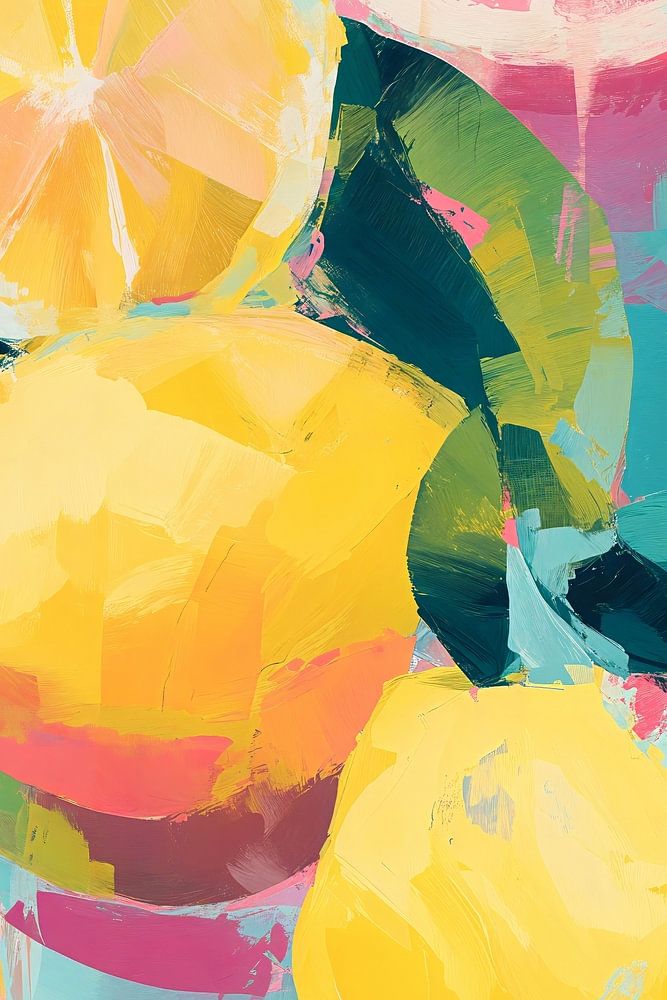 Ein lebendiges Kunstwerk, das Zitrusfrüchte in einer erfrischenden Komposition einfängt. Die saftigen gelben Zitronen und die rosa Grapefruit springen vor einem türkisfarbenen Hintergrund förmlich von der Leinwand. Die lockeren Pinselstriche und die tropfende Farbe erzeugen einen dynamischen, modernen Look, der sommerliche Energie ausstrahlt.