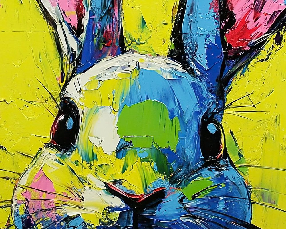 Sommerkaninchen Farbe | Fröhliches Kaninchen mit Ohren - Dieses Tierbild zeigt ein farbenfrohes Kaninchen mit großen Ohren vor einem leuchtend gelben Hintergrund, und das Kaninchen hat einen fröhlichen Blick mit blauen und grünen Tönen.