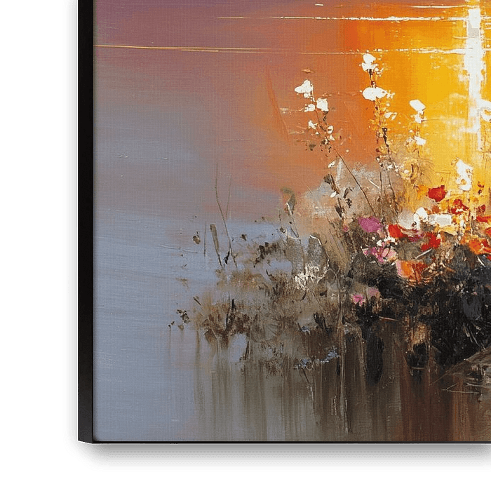 Bringen Sie die Atmosphäre eines mediterranen Sommerabends in Ihr Zuhause mit diesem romantischen Gemälde: Blumen in voller Blüte schmücken das Ufer eines klaren Sees, während der Sonnenuntergang ein warmes Licht auf die Berge wirft.