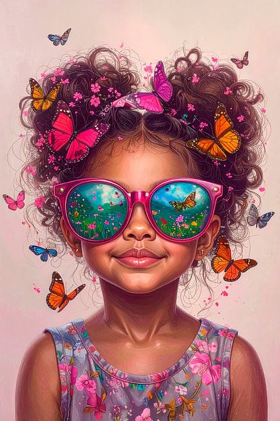 Ein junges Mädchen mit Schmetterlingen und kleinen rosa Blüten im Haar und einer großen rosa Sonnenbrille. In der Sonnenbrille spiegelt sich eine Naturlandschaft wider, eine Wiese mit Gras, Blumen und Schmetterlingen. Das Mädchen hat dunkles Haar, das zu zwei Zöpfen gebunden ist, und sieht afrikanisch aus. Eine fröhliche, verträumte,…