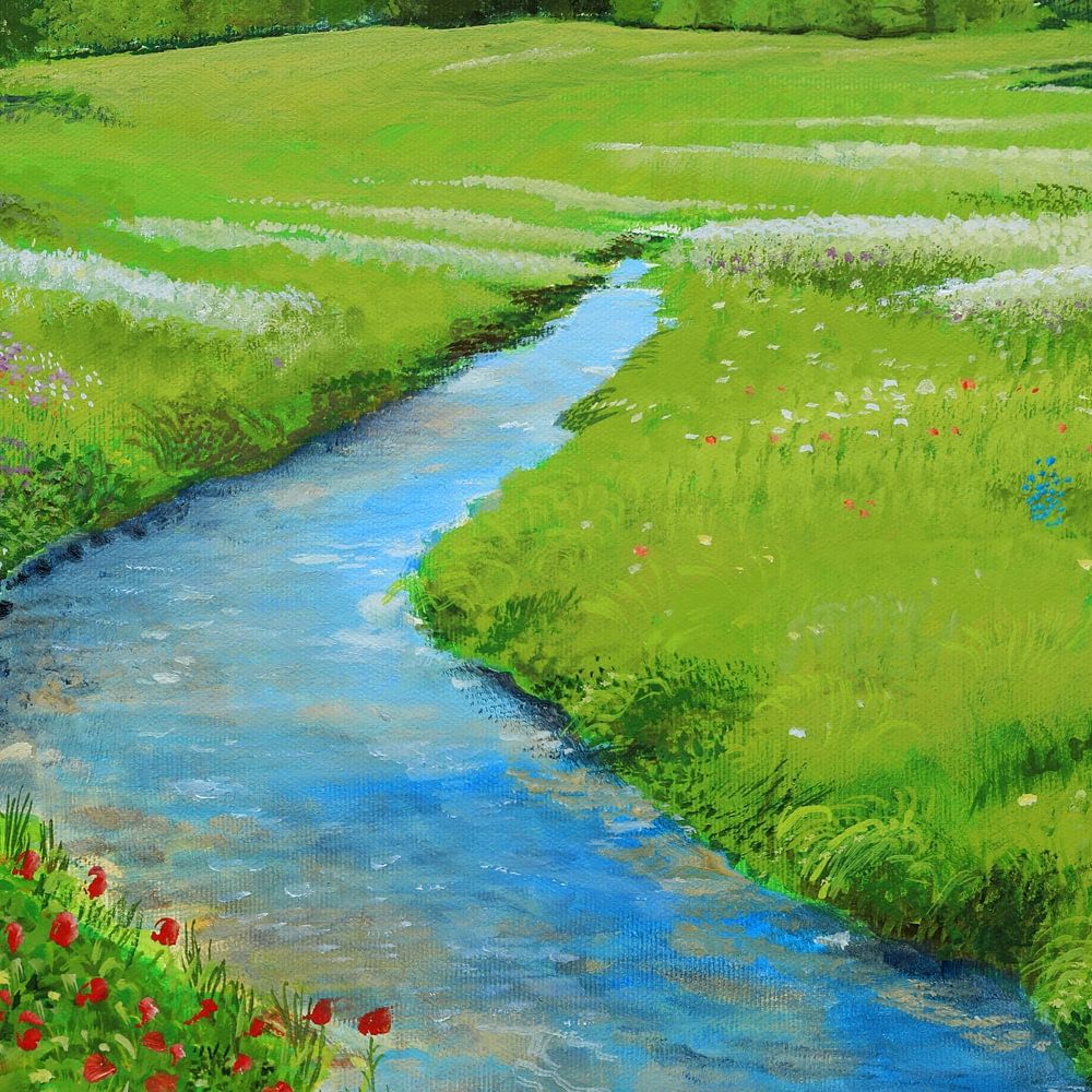 Das Gemälde soll nicht nur dekorativ sein, sondern auch Freude und Ruhe ausstrahlen. Die hellen und dunklen Bäume bilden einen starken Kontrast, der die Tiefe und Dynamik der Landschaft betont. Die Wiese ist mit abwechslungsreichen Blumen verziert, die Farbe und Lebendigkeit ins Bild bringen.