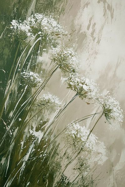 In dieser grün-beigen Darstellung entfaltet sich ein stiller Moment in der Natur. Schlanke Stiele von Doldenblütlern ragen aus einem Feld sanfter, verschwommener Grautöne empor. Ihre zarten Blütenstände breiten sich wie kleine Sterne oder feine Spitzenstrukturen aus, leicht und fast schwerelos vor dem Hintergrund.