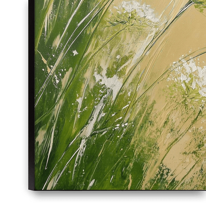 Dieses Gemälde fängt einen flüchtigen, fast traumhaften Moment in der Natur ein: einen sanften Sommerwind, der durch ein Feld voller Wildblumen streicht. Schlanke grüne Stiele neigen sich leicht im Einklang mit der Bewegung der Luft, als würden sie gemeinsam in einem ruhigen Rhythmus tanzen. Die weißen Blütenstände scheinen über dem…