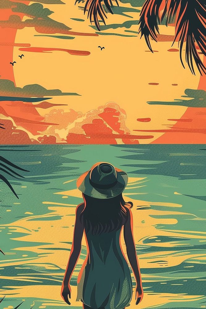 Sommerliches Jugendstilbild einer Frau in einem Kleid mit Hut, die in Richtung Meer geht. Palmen, die untergehende Sonne, der Strand und das Farbschema ergänzen das Sommergefühl. Das Farbschema ist orange, gelb, blau und schwarz. Es gibt auch helle Wolkenschatten und Vögel in der Ferne. Passt zu verschiedenen Stilen und Trends. Vektorbild. Künstlerin: Bianca ter Riet.