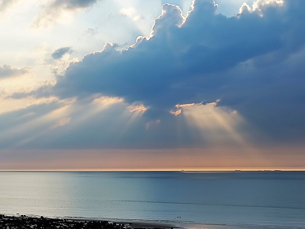 Sehen Sie sich diesen Himmel an! Dieses Foto fängt das Beste aus beiden Welten ein: Auf der einen Seite schweben diese dramatischen Gewitterwolken bedrohlich über dem Meer, und auf der anderen Seite leuchten diese wunderschönen Lichtstrahlen von der Sonne herab, wie eine himmlische Krone.