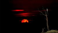Dieses Foto fängt einen Sonnenuntergang auf seine dramatischste und intimste Weise ein. Die Sonne sinkt wie eine feurige Kugel hinter den Silhouetten der Bäume, während ein Vogel hoch in den kahlen Ästen sitzt wie ein stiller Wächter über der Landschaft. Die tiefen Rottöne am Himmel bilden einen wunderschönen Kontrast zum dunklen…